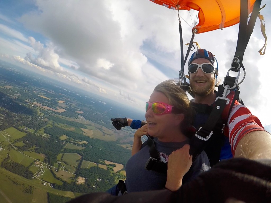 I woke up one Friday morning and just knew that today was the day, it was going to happen, I was going to go skydiving. I’ve talked about it enough, time to put some action to my words. Time to quench this yearning inside of me. I called TN Skydive and asked some questions. I checked their online bookings to check availability at least a dozen times that morning. I even watched some of their videos on Youtube trying to prepare myself. I talked with my husband and decided to just go for it. I called and made a reservation to jump at 4pm. Once I made the commitment, my nervousness lessened. I anxiously awaited the time and finally it was time to leave. I remember calling my parents and telling them what I was on my way to go do, and if they wanted to watch they would need to come on over. It wasn’t a big surprise to them, they know me well. Once I got to the location, the process of getting ready was quite simple and quick. I met my trainer Justin, he went over a few instructions, and I got harnessed up. I cannot explain it, but once the harness was on, I was overcome with a sense of peace. I was excited, still couldn’t believe I was actually fixing to do this, because I had talked about it for many years. I boarded the plane with around 10-12 other people. Most were single jumpers, but there was 3 others doing tandem like me. This was their second tandem jump. The atmosphere in the plane was one of excitement and enthusiasm. It did get a little hot in that plane, but once we got so high up, they opened the door. The rush of cool air was a welcoming relief. The adrenaline started kicking in and I was ready to take the plunge! As we gained altitude, the views were absolutely beautiful. It was a gorgeous blue sky with white puffy clouds scattered about. We were close to the last ones to jump. Somehow beyond my understanding, standing at the edge of the door looking down from 14,000 feet, I was calm. I think I was more in awe at God’s creation and was so thankful that this adventure that I had dreamed about doing for so long, well it was about to happen. I remember Justin saying we would rock back and forth and on the third count, we would jump. I don’t recall any rocking, just falling forward into the big open sky. I am not gonna lie, I had my eyes closed for the first 5 seconds. They tell you to hold your head back and I assumed it was a safety measure. I opened my eyes to see the ground beneath me and felt the cool air hitting my face. You get up to 100-120 mph when you are doing the free fall and it last for 60 seconds. The funny thing is, you don’t feel like your falling. You feel like your just out there floating. I remember it being loud, so loud I couldn’t even hear my own screams of excitement. Justin pulled the chute and it jolted us back up into the sky. The ride down under the canopy was very surreal and peaceful. You have to be able to hold your legs up when you land, so the person you are hooked up to can land safely. A lot of times when you are landing, you slide onto the ground on your bottom to stop and that in itself had me laughing when it was over. Oh, the freedom and beauty of that jump just left me with a big smile on my face and gratefulness on my heart. I would have to say my favorite part was the free fall. There are no words to really describe it. Those that have skydived get it. No doubt, the rush of adrenaline and the freedom you feel while in the air draws people back to do it again and again. Would I ? Absolutely.